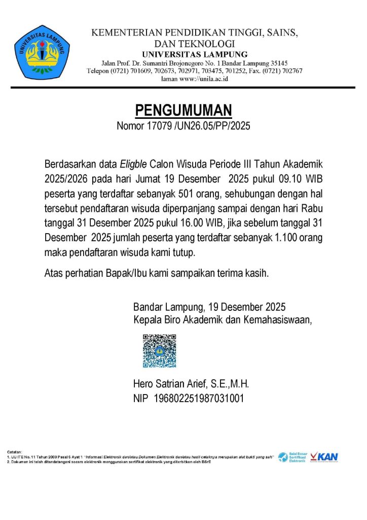 Berdasarkan data Eligble Calon Wisuda Periode III Tahun Akademik 2025/2026 pada hari Jumat 19 Desember 2025 pukul 09.10 WIB peserta yang terdaftar sebanyak 501 orang, sehubungan dengan hal tersebut pendaftaran wisuda diperpanjang sampai dengan hari Rabu tanggal 31 Desember 2025 pukul 16.00 WIB, jika sebelum tanggal 31 Desember 2025 jumlah peserta yang terdaftar sebanyak 1.100 orang maka pendaftaran wisuda kami tutup.