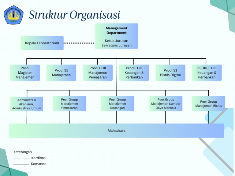 Struktur organisasi Program Studi S1 Manajemen adalah kerangka kerja atau sistem yang mengilustrasikan hierarki, hubungan kerja, peran, dan tanggung jawab antar anggota dalam suatu organisasi atau perusahaan untuk mencapai tujuan bersama secara efektif dan teratur. Struktur ini memastikan bahwa setiap individu mengetahui peran dan tugasnya, sehingga memudahkan koordinasi dan mencegah kekacauan dalam pelaksanaan aktivitas bisnis.